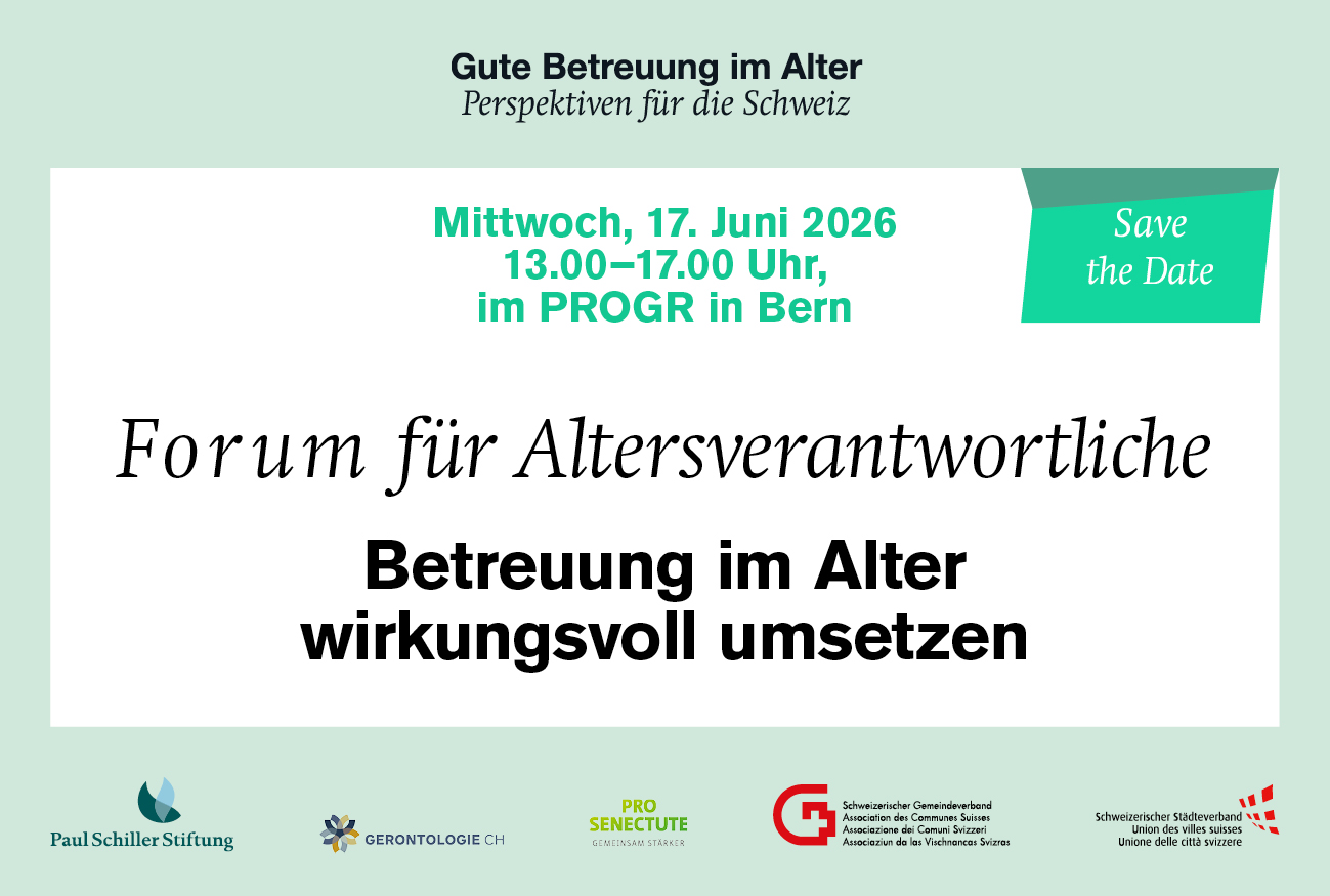 Wir freuen uns, nach der Erstdurchführung 2024 erneut zum Forum für Altersverantwortliche einzuladen. Thema des Anlasses ist die «Betreuung im Alter wirkungsvoll umsetzen – im Rahmen der neuen Finanzierung über Ergänzungsleistungen und darüber hinaus». Der Anlass wird von der Paul Schiller Stiftung organisiert und von GERONTOLOGIE CH und weiteren Organisationen mitgetragen.